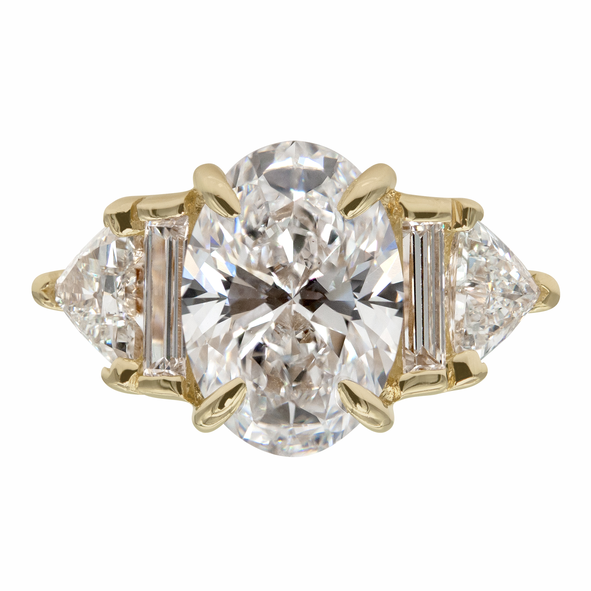 This fully custom engagement ring centers a 3.06ct VS1 oval lab grown diamond, flanked first by a pair of baguette diamonds and then triangle cut diamonds on the outer edges. The mix of shapes creates a strong, architectural five stone layout with clean lines and sharp geometry that draw the eye to the center. Round reclaimed diamonds add subtle extra sparkle throughout the design. Made in 14kt Fairmined yellow gold with a polished finish.