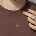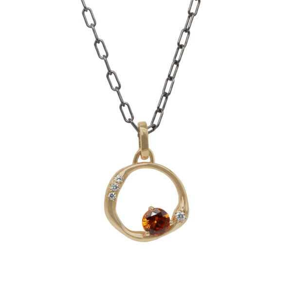 The Limited Edition Aura Necklace No. 4 captures the essence of energy and light with its radiant mix of materials and form. A 4.5 mm spessartite garnet set in 14k yellow gold glows at the center, suspended from an oxidized sterling silver paperclip chain. Four reclaimed round brilliant cut diamonds 0.28ctw add a subtle brilliance, echoing the ever-glowing aura that surrounds us.