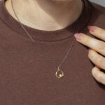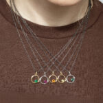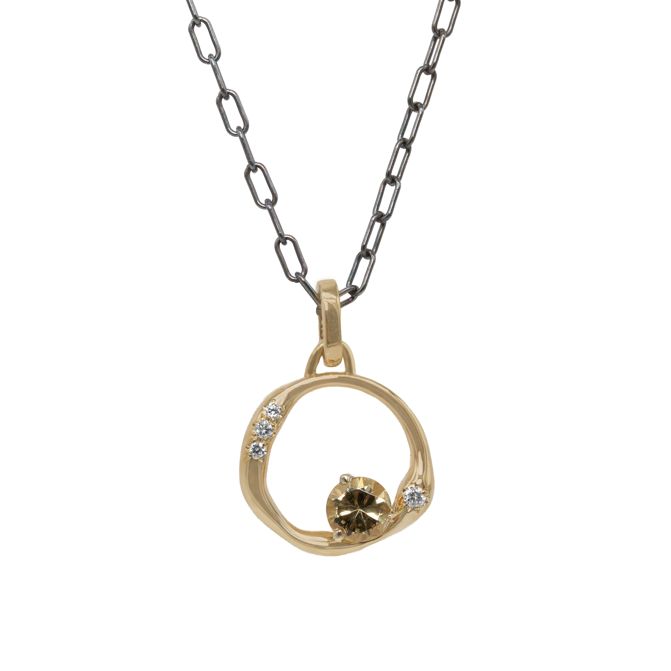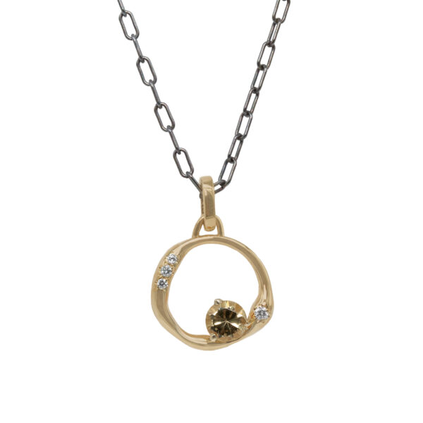 The Limited Edition Aura Necklace No. 3 captures the essence of energy and light with its radiant mix of materials and form. A 4.5 mm grossular garnet set in 14k yellow gold glows at the center, suspended from an oxidized sterling silver paperclip chain. Four reclaimed round brilliant cut diamonds 0.28ctw add a subtle brilliance, echoing the ever-glowing aura that surrounds us.