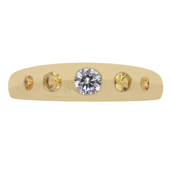 Sleek and functional, the Hague Ring keeps its ultra low profile and burnished set center stone. The brushed finish gives it that metal forward feel, modern but still classic. Now a five stone, adding just enough movement and detail without overcomplicating it.
